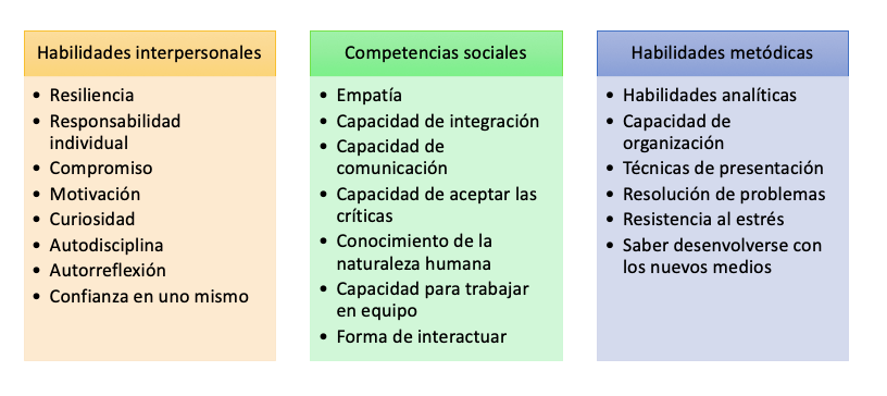 Las soft skills hacen referencia a aquellas competencias que dan capacidad a la persona de motivar y trabajar en equipo y, también, en un sentido más amplio, a aquellos rasgos del carácter que hacen a una persona. Normalmente, las soft skills pueden dividirse en tres categorías: habilidades interpersonales, competencias sociales y habilidades metódicas. Esencialmente, estas tres categorías responden a las siguientes cuestiones: ¿cómo actúas como individuo independiente?, ¿cómo actúas como individuo social? y ¿de qué manera te enfrentas a los desafíos?